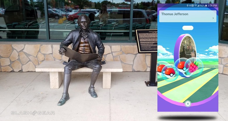 The photo at the head of this article was shot at the North Dakota State Capital history museum, in front of which there's a Pokeball, but only just after it's rained. This is also a PokeStop centered on nearby petrified wood and rock spheres. Below you'll see Thomas Jefferson, who sits in front of a Scheels at a local mall.