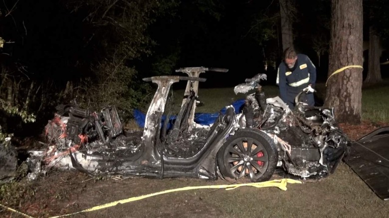 A 2019 Tesla Model S traveling at high speed north of Houston failed to make a slight curve and went off the roadway. It crashed into a tree and burst into flames, a fire that took fighters four hours to finally put out. Two male bodies were recovered inside and their positions in the car don't bode well for Tesla's self-driving features.