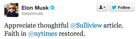 The end result – or what could be expected to be the end result, if not final chapter in this particular saga – is Musk tweeting a simple acknowledgement of the article. "Appreciate thoughtful @Sullivew article" it stated, "Faith in @nytimes restored." Sound alright to you? Have a peek at the timeline below regarding the extended saga to see more details throughout.