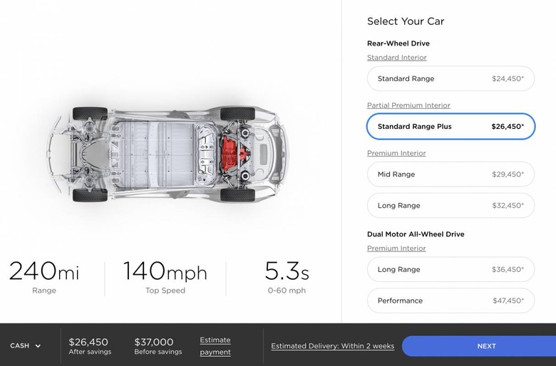 The Tesla Model 3 Standard is expected to ship in 2-4 weeks if ordered today. It's $35,000 before any federal and state incentives. The Model 3 Standard Range Plus is $37,000 before incentives, and is expected to ship in two weeks.