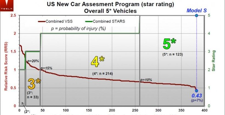 The individual categories aren't published with a rating that comes in at higher than 5. That doesn't mean a score wasn't higher, however, with one being able to discern such based on the overall score the vehicle achieved. In Tesla's case, its Model S was awarded with an overall score (called the Vehicle Safety Score) of 5.4 stars.