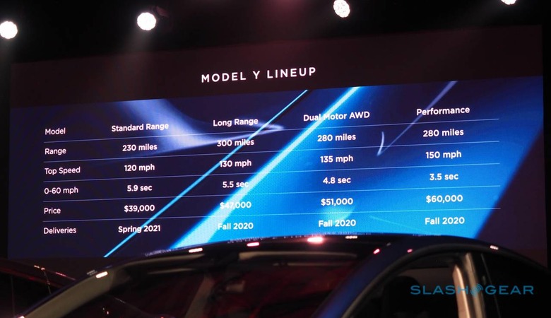 As was the case with the Model 3, though, you won't be able to buy a $39k Model Y from the start. Tesla will instead launch the Long Range, Dual Motor AWD, and Performance versions of the car initially. That will mean the most affordable Model Y will, at first, be $47,000.