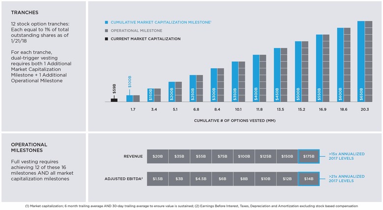 Now, with the "Master Plan, Part Deux" underway, the stakes are even higher. Musk faces a ten year grant of stock options, vesting in 12 tranches. Again, each tranch depends not only on Tesla's market cap, but operational milestones too.
