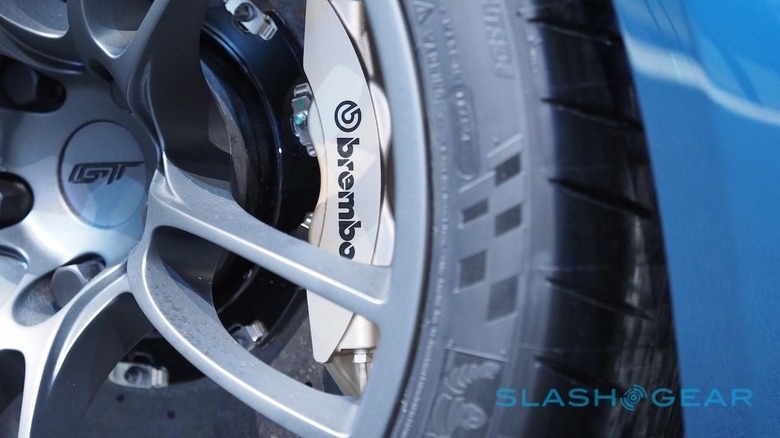 Assuming you'll want to stop at some point, there are power carbon ceramic matrix disc brakes on all four wheels, with a four-sensor, four-channel antilock braking system and AdvanceTrac electronic stability control. At the front of the GT, there are 394 x 36 mm floating-type vented and cross-drilled discs, with Brembo six-piston fixed aluminum calipers. At the back, there are 360 x 32 mm vented and cross-drilled discs, along with Brembo four-piston fixed aluminum calipers and an electric Brembo spot caliper parking brake.