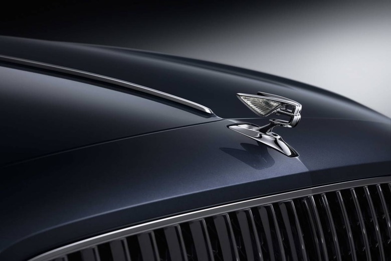 Just as you'd expect, the details are where the new sedan shine. Outside, LED matrix headlamps with cut-crystal effect detailing are standard, and Bentley has added a chrome sleeve to make them sparkle even when they're not lit up. New 21-inch and 22-inch Mulliner Specification wheels are available, and you can optionally have the Flying B mascot on the hood. That retracts when the car is locked, and is illuminated when extended.