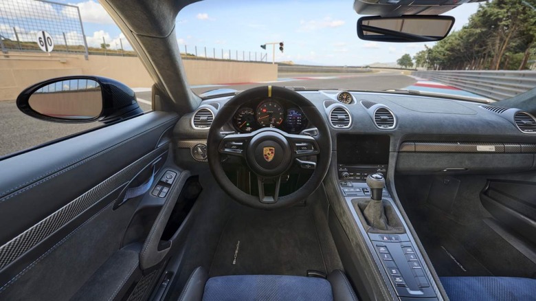 20-inch forged aluminum wheels with center locks are standard – a first for the Cayman – while Porsche will also offer a Weissach Package for those wanting an even more distinctive look. That uses carbon fiber for the front luggage compartment lid, the process air intakes, cooling air intakes, the air box lid, exterior mirrors caps, and the rear wing. Titanium exhaust tips are included, too, while inside the dashboard gets Race-Tex trim. Magnesium wheels can be added in, too.