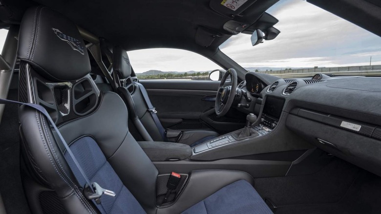 Porsche claims the changes are done with functional demands in mind, though the fact that it leaves the coupe looking seriously menacing sure doesn't hurt either. The hood and front fenders use carbon fiber reinforced plastic (CFRP), trimming weight while also adding a motorsport styling nod. The door panels are lighter than in a regular Cayman, too, and the rear window uses special lightweight glass.
