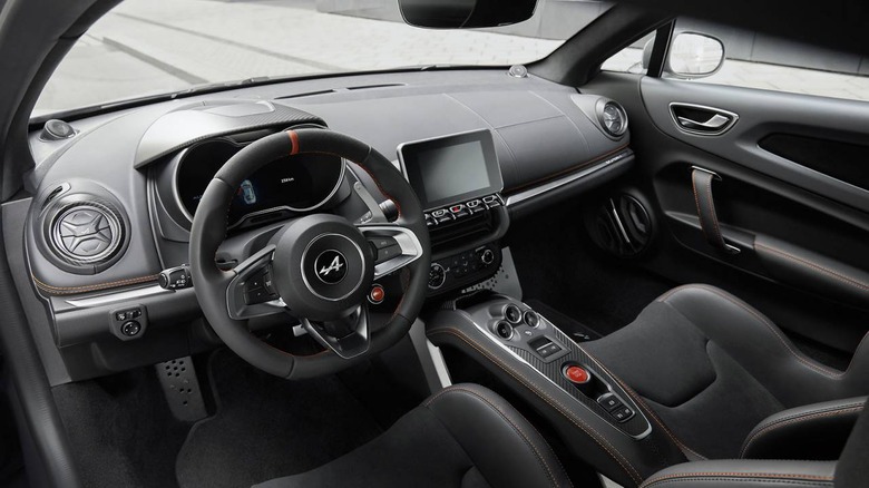 Inside, the blue A110 stitching is replaced with orange, and there's black Dynamic upholstery on the roof lining, door panels, and visors. The lighter Sabelt seats, too, get the same fabric, and there's a leather and Dinamica wrapped steering wheel. More carbon fiber and orange emblems are scattered throughout, and there are lightweight aluminum pedals.