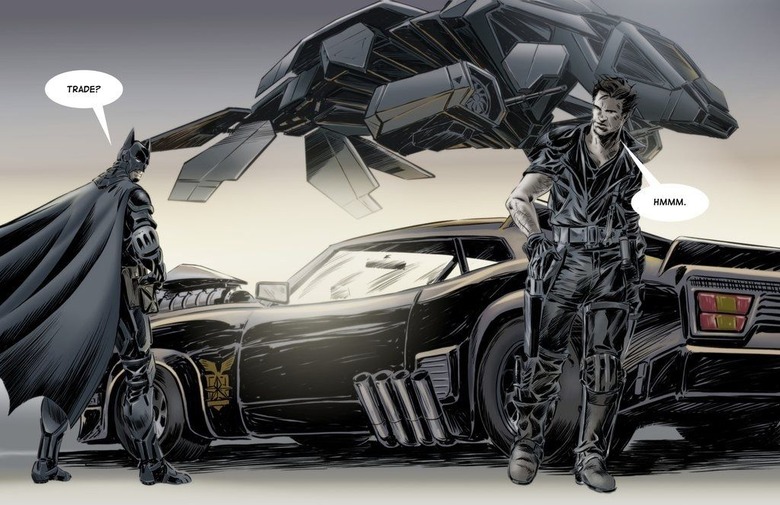 These two titans of pop culture history, Mad Max and Batman, have crossed paths more than a couple times. Mad Max and Batman have two of the most fantastical tricked-out and/or iconic rides in the history of visual storytelling – it had to happen! If you'll look below, you'll find a classic bit of fan art by Zeustoves.