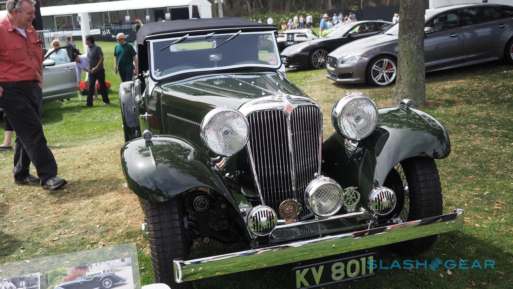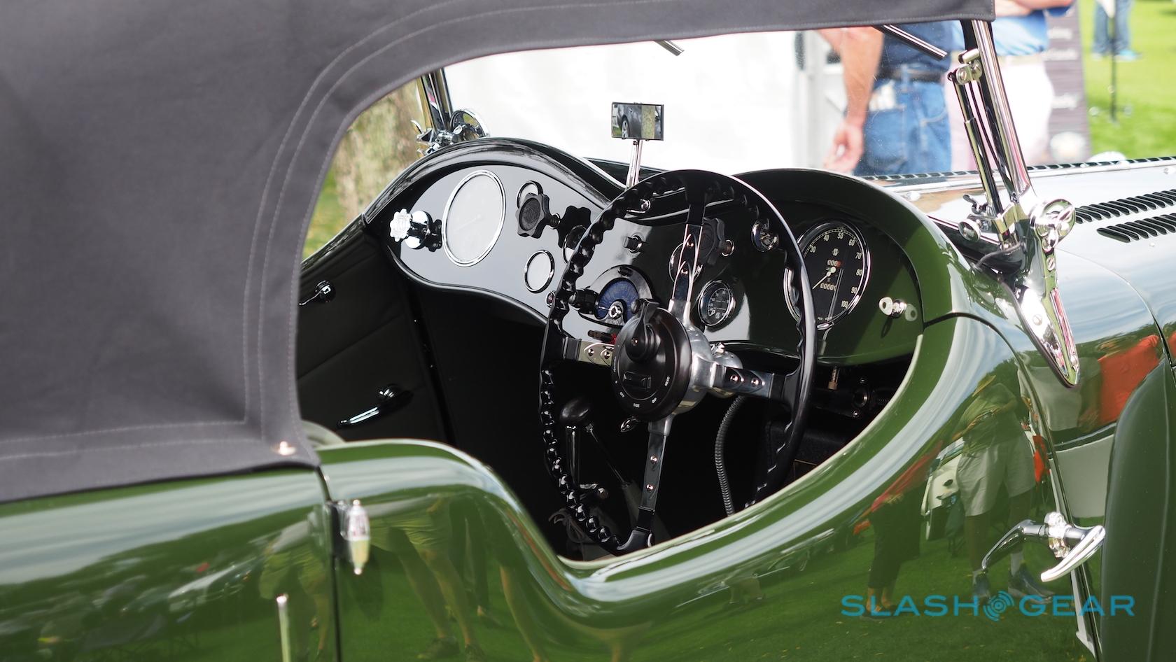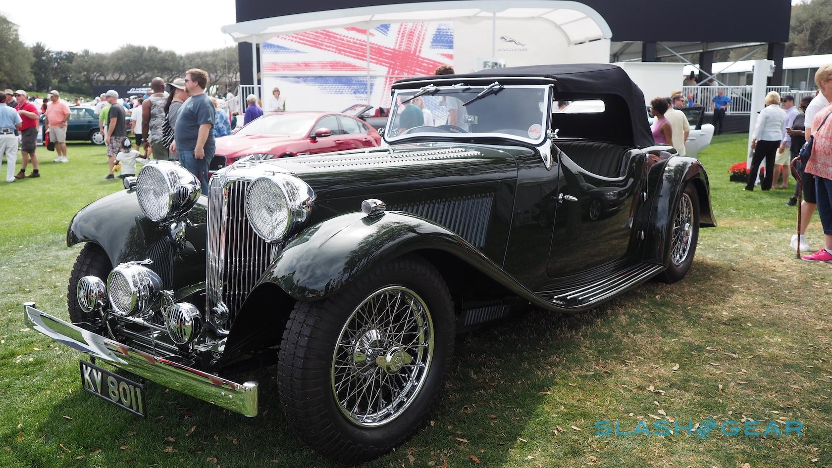 No such problems with the 1934 SS1 Walmsley Roadster, precursor of the Jaguar, and – despite the classic looks – an astonishingly modern car in its construction. A one-off customization of the SS1, with a 6-cylinder side valve engine, it not only used aluminum body panels for much of its construction (a rarity at the time) but was one of only a few cars of its period to get features like adjustable shock absorbers, chrome wire wheels, and an Ekco CR75 car radio.