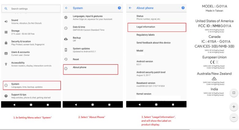 *Regulatory Labels – this is odd, too. The images HTC presents in the FCC listing instruct the FCC to tap System, About Phone, then Legal Information. In reality, the user will want to tap "Regulatory Labels" to get the last screen on the right.