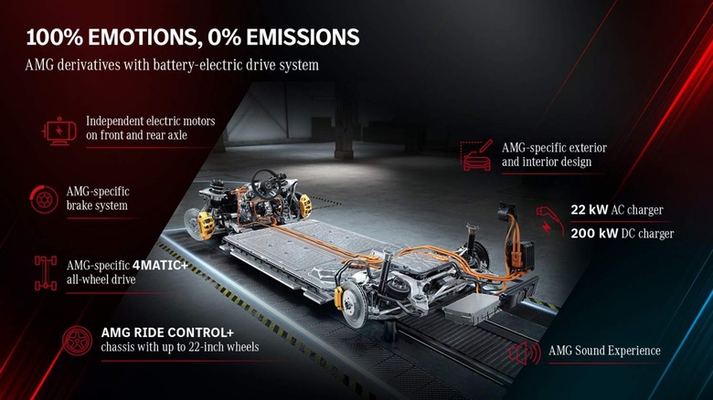 For power, there's a 400 volt li-ion battery, with a custom AMG wiring harness to handle higher performance operation. It'll support up to 22 kW Level 2 charging, and up to 200 kW DC fast charging.