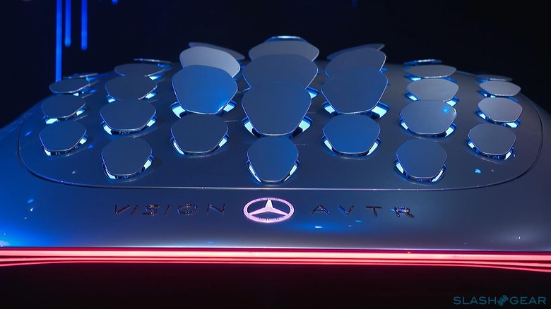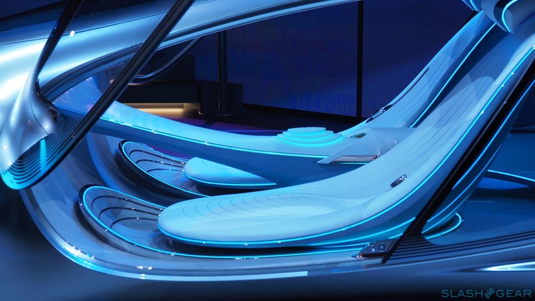The screen could also allow the var's occupants to become aware of various energy forces that are not readily visible to the naked eye, things like ultraviolet light, magnetic fields, and bioenergy waves. The actual functionality dips heavily into the lore of "Avatar" the movie, and particularly the idea of family and collective groups. If, for example, the car spots that a family is onboard, it will automatically begin showing displays for the parents in the front seats, so they can monitor what the kids are doing in the rear. The parents' pulse is replicated by lighting patterns on the rear of their seats, which Mercedes says should give rear occupants "a sense of connectedness and security." Then there's the "Magic Pool," which is the VISION AVTR's version of rear-seat displays. It includes games and augmented reality experiences focused on entertaining and educating younger passengers.