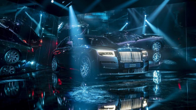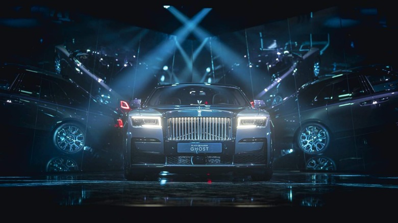 Inside, popular features like the Shooting Star Starlight Headliner are kept, together with the glowing star-like motif that glitters in the dashboard. It's paired here with custom timepieces for the Black Badge Ghost, and metal trim pieces given the same smoky finish as the exterior trim.
