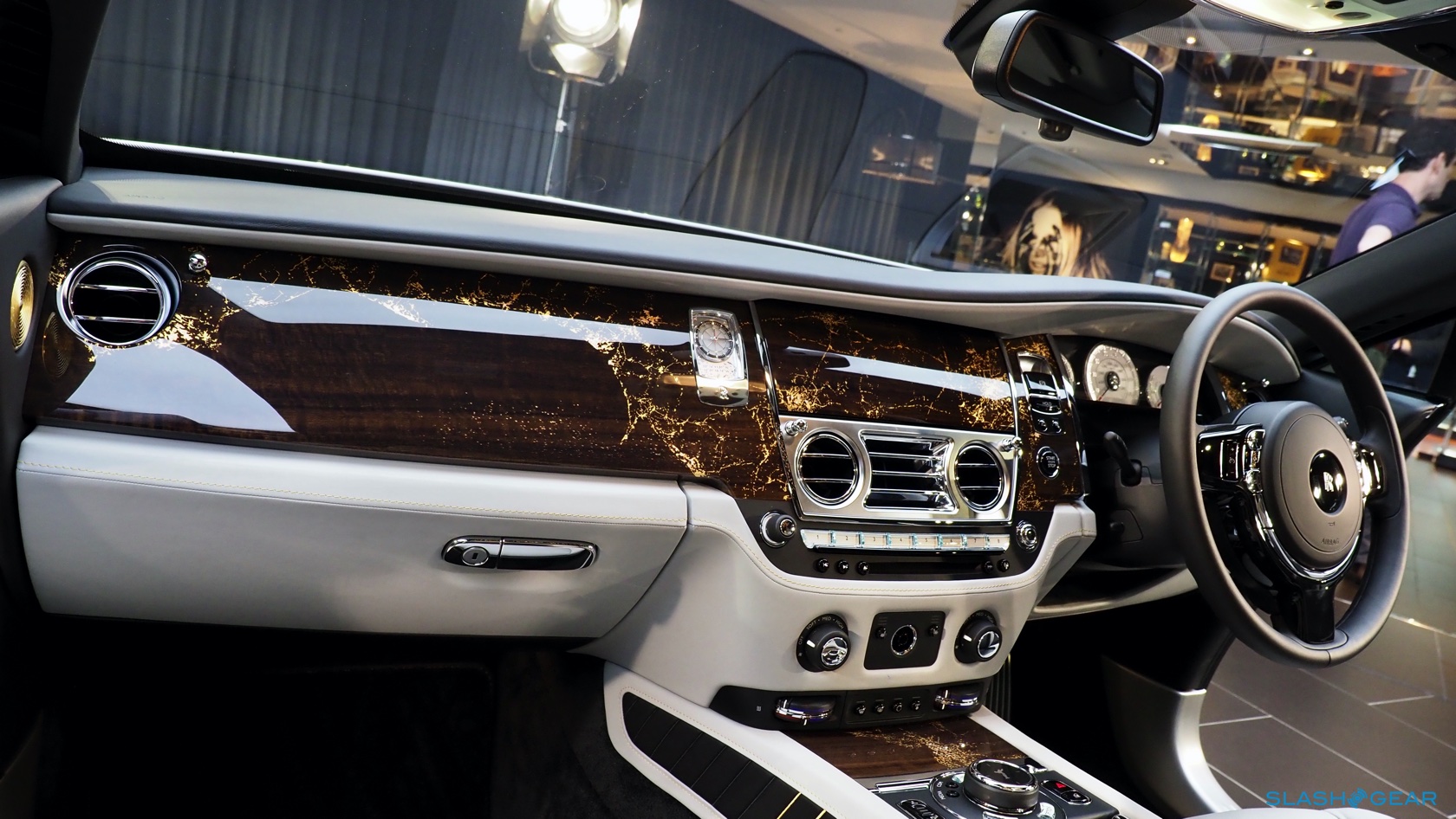 Meanwhile, the dashboard and console are designed to represent a modern-day abstract interpretation of what Alcock and Brown saw as the aircraft flew clear of the fog. It's beautiful to behold and speaks highly of Rolls-Royce's dedication to making the most sought-after bespoke car in the world. Of course, wood is at the center of it all, and Rolls-Royce chose Smoked Eucalyptus planks for this occasion. Each piece is vacuum metalized in gold with silver and copper inlays. You can see the rich detail and meticulous craftsmanship that went into each piece. It also connects the starlight headliner with the rest of the vehicle for a genuinely awe-inspiring driving experience.