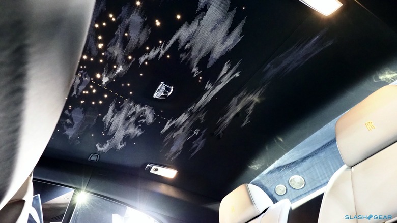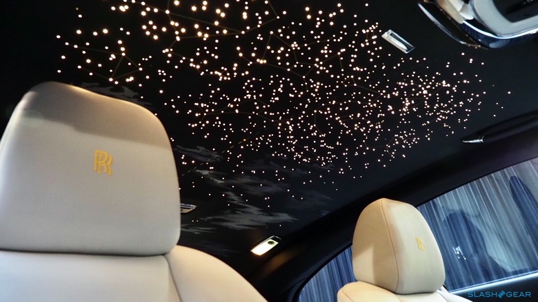 But the single most striking element in the interior is the starlight headliner. Unlike the starlight headliner in your Phantom, the Wraith Eagle VIII has embroidered clouds that took a week to create by hand. There are 1,183 starlight fibers in the headliner, which are arranged to depict the celestial arrangement during the 1919 flight. The flight path and constellations are embroidered using brass thread, but the red fiber optic light points to the exact moment when the duo lifted above the clouds to navigate by sextant.
