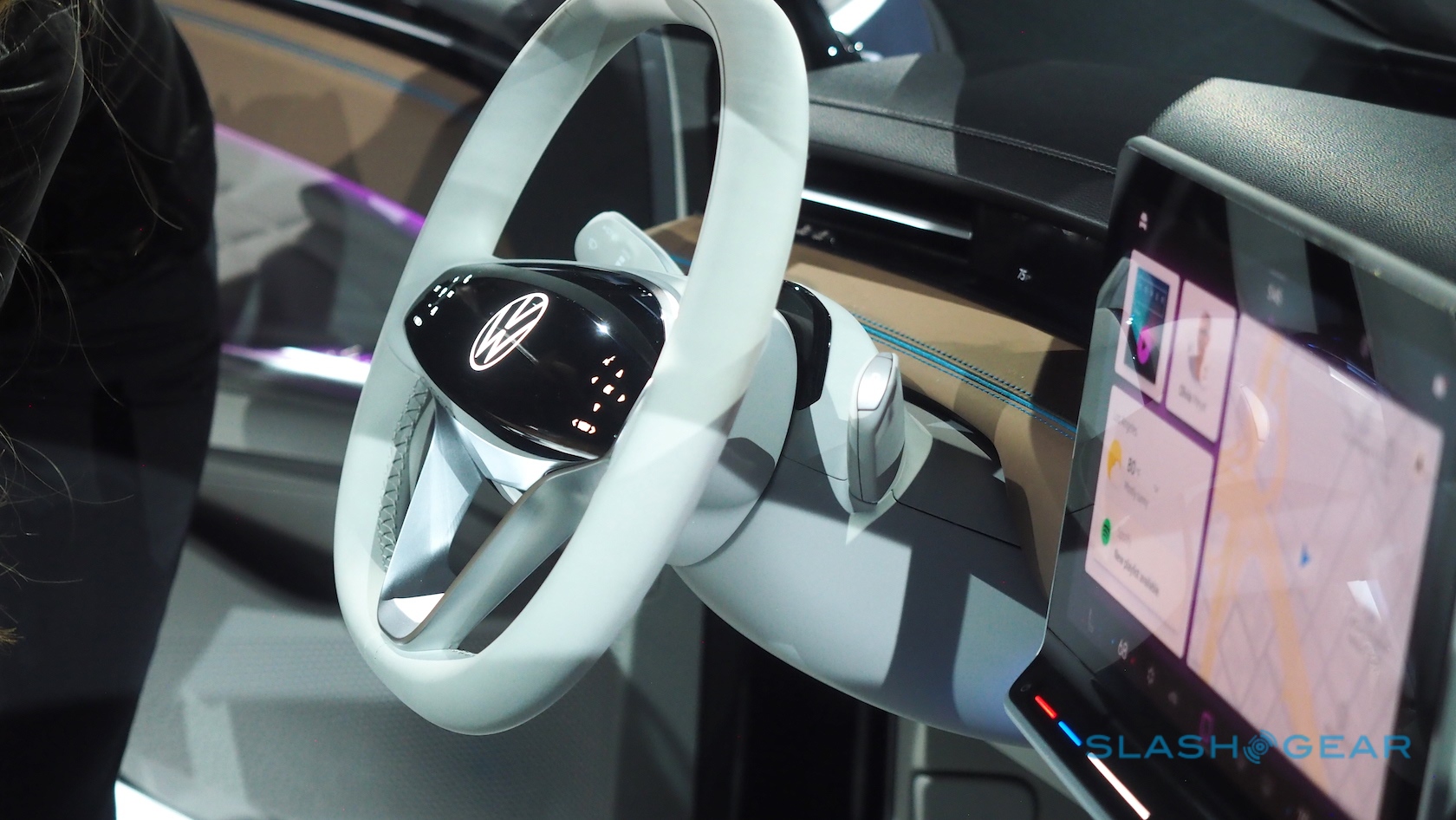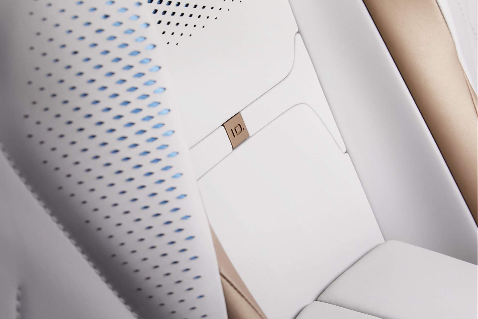 Inside, there's seating for four, though VW says it could add a rear bench instead and accommodate a fifth person. Rather than leather, there's AppleSkin, a faux-leather made in part from residual matter from apple juice production. VW has used chrome-like paint rather than actual chrome, and done away with plastic decorative inserts in favor of more AppleSkin. The automaker says it'll be doing that with all ID. models, and that future iterations of the material will have metallic finishes and ambient illumination.