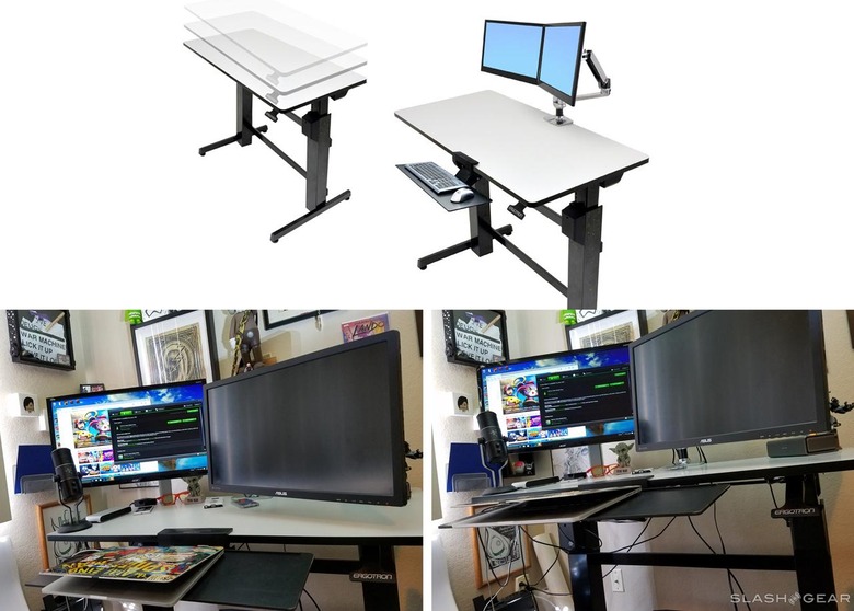 The desk – since we're not using space here for a keyboard, has been occupied by the Wacom Cintiq 27 QHD Touch I'd been reviewing for several weeks. Once I was done working for the day, I'd just push the two displays above out of the way and begin work on illustrations.