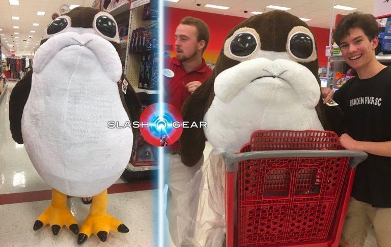 The hulking beast shown above and below is several times the size of its course material. These creatures are Porgs, and they were given away on Force Friday at select Target locations throughout the United States. Folks needed to be there for the midnight opening to see this stuffed animal, and only one lucky customer per Target walked away with this extravagant toy for themselves.