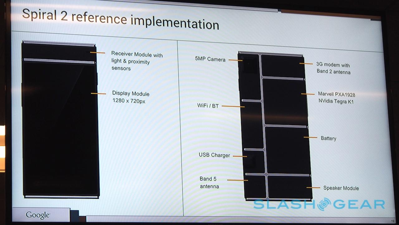 Google has also confirmed the exact Spiral 2 reference specifications. There'll be a 1280 x 720 display, light & proximity sensors, a 5-megapixel camera, WiFi and Bluetooth, 3G modem with a Band 2 antenna, separate Band 5 antenna, battery, and speaker module, as well as the choice of a Marvell PXA1928 or NVIDIA Tegra K1 processor block. A final block will have the USB charger port.
