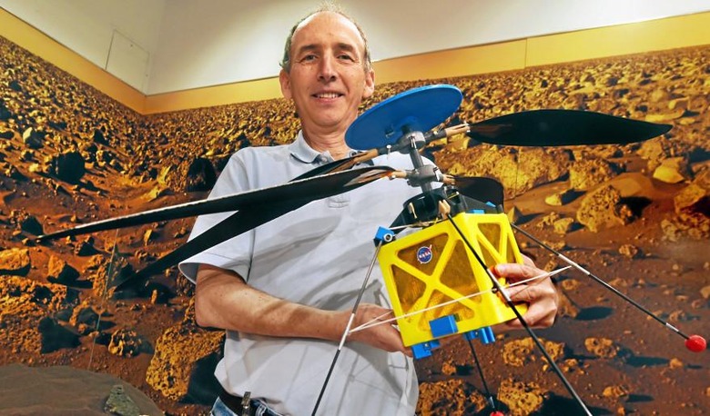 The image above depicts a scale model of the craft held by Matthew Golombek, study scientist for Mars Helicopter. This photo was captured at the Jet Propulsion Laboratory as the JPL first sought funding from NASA to build the drone, back in January of 2015.
