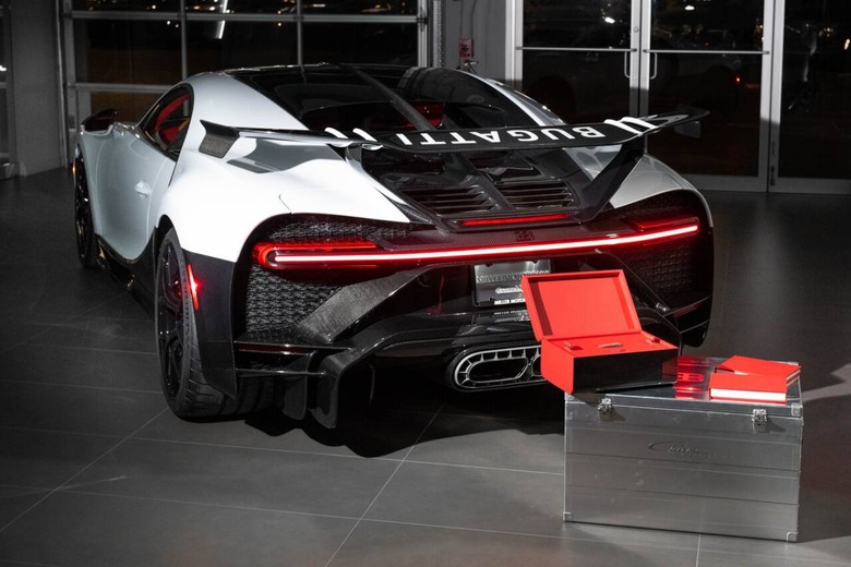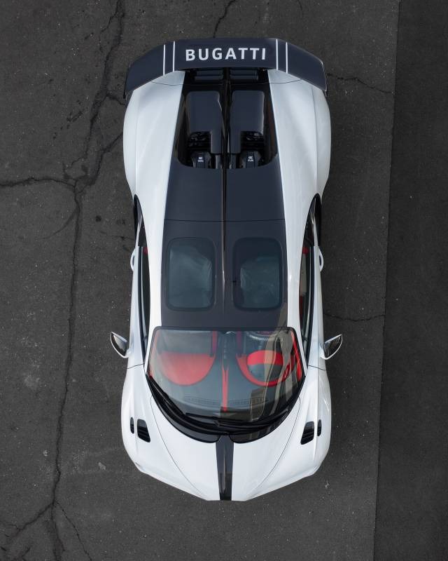 The first Chiron Pur Sport to arrive in U.S. soil has Quartz White paint with a contrasting Grey Carbon split. Meanwhile, the lower panels are finished in grey exposed carbon, and the roof, rear wings, side mirrors, and Bugatti horseshoe grille feature the same naked carbon finish. Of course, it also has Bugatti's exclusive Sky View roof, while the owner can bask in the vehicle's sumptuous Italian Red leather interior.