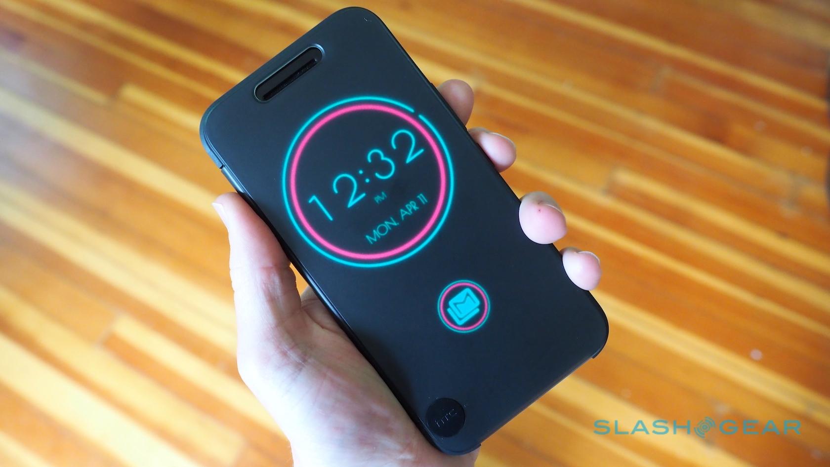 Meanwhile, the old Dot View case has had a higher-res makeover, and is now the HTC Ice View case. Instead of lots of little perforations, the cover is now frosted plastic, through which a special neon-like lock screen glows through. The date/time/weather, app notifications, phone calls, and messages all show up, and you can interact with them even with the case closed.
