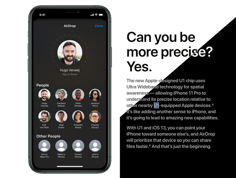 "Ultra Wideband technology comes to iPhone," said the original feature listing back on September 10, 2019, as the iPhone 11 was introduced. "The new Apple-designed U1 chip uses Ultra Wideband technology for spatial awareness – allowing iPhone 11 to precisely locate other U1-equipped Apple devices. Think GPS at the scale of your living room."