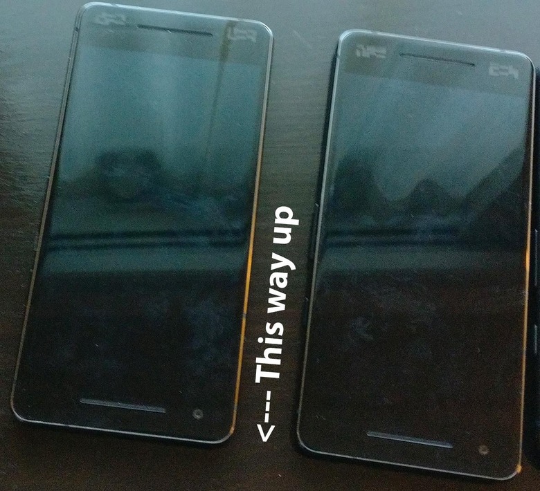 BELOW: A photo leaked quite recently shows the Pixel 2 next to another Pixel 2, both upside-down. This leak confirmed suspicions we had earlier this year. These devices have the markings of radio and/or field testing upon them – they were near their final battles before being given the OK, there.