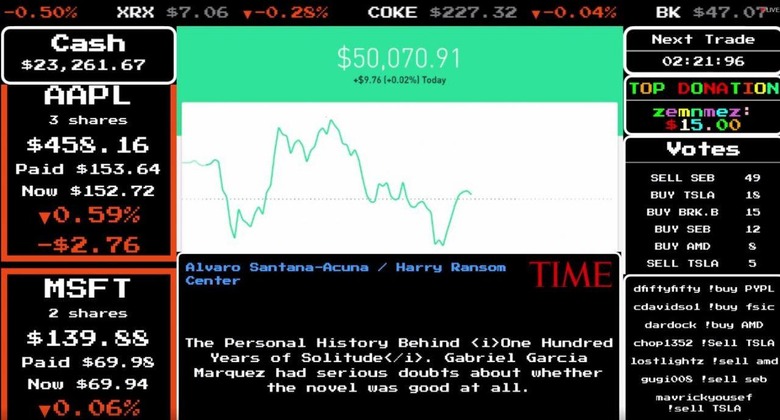 This person, streaming under the Twitch account StockStream, has put $50,000 of his own money on the table and is giving Twitch the opportunity to invest that cash in the stock market. The stream's title says that this is the "world's first cooperative multiplayer stock market game using real money," and we certainly don't doubt that.