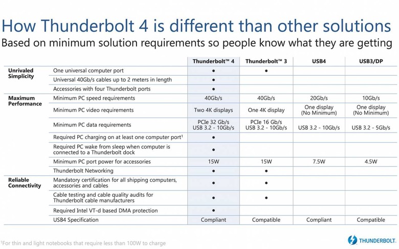 The 15W minimum port power rating is carried over, though of course higher wattages for properly charging laptops rather than just tablets and smartphones are likely. Thunderbolt 4 will also support universal 40 GB/s cables at up to 2 meters (6.5 feet) in length. It'll be fully compliant with the USB4 specification, too, and Intel says it's working on supporting cables up to 50 meters in length.
