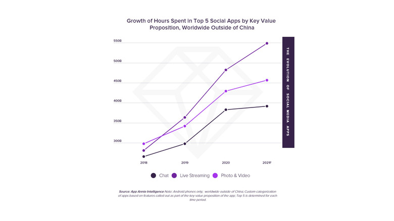 The same study showed major growth in hours spent in the top 5 social apps by users worldwide (outside of China). Between 2018 and 2019, Live Streaming surpassed the Photo & Video category of social apps, and both categories have stayed well ahead of chat apps for the past several years. While Chat and Photo & Video apps seem to have seen slowing growth between 2020 and the first half of 2021, Live Streaming apps continue to grow in popularity by leaps and bounds.