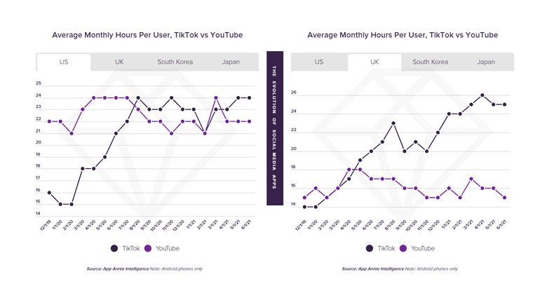If we're looking at monthly average time per user, and we're watching the USA and UK first, TikTok just surpassed YouTube. Video viewing time changed the way social media was handled, and while YouTube was (and remains) the defacto go-to name for video online, TikTok's meteoric rise reached YouTube levels for the first time over the past half-year. The year 2020 contributed to the most giant growth in use of social apps in recent recorded history – not least of all because users wanted to watch videos while sitting at home.