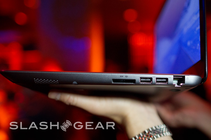 All of the LED lights and chrome-accented hinges have been replaced with a more elegant design but nothing groundbreaking or extremely new — but definetaly a step up from current offerings. The chicklet style LED-backlit keyboard is a nice addition but something we'd expect from an ultrabook in this day and age. While this is an early unit that clearly didn't have a name we do have USB 3.0, two USB 2.0 ports, HDMI-out, Ethernet and the usual SD card readers and headphone/microphone ports. Remember that while being extremely new and only a prototype all that can be subject to change. One good note is we'll be working along with Windows 8 whenever this makes way to consumers hands.