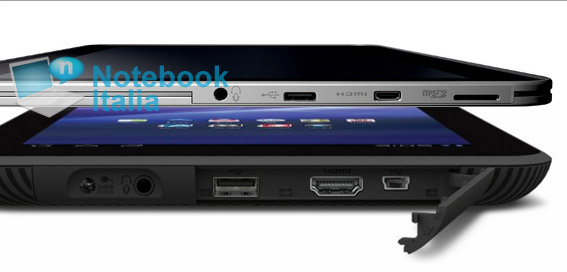 There's also a microUSB port and microSD card slot, a front-facing webcam and a combo headphones/microphone socket. Internal hardware is unconfirmed, but we're guessing Toshiba will stick with the tried and tested NVIDIA Tegra 2 chipset, just as runs in the Thrive. Connectivity is likely to include WiFi and Bluetooth, with perhaps a 3G/4G option for mobile internet users.