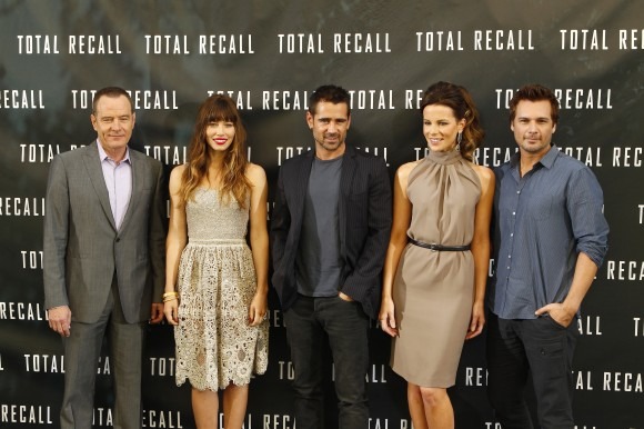 From left: Brian Cranston, Jessica Biel, Colin Farrell, Kate Beckinsale, and Len Wiseman as they appeared in Los Angeles for the Total Recall junket.