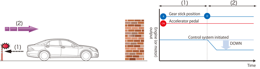 "For example," Toyota explains, "if while reversing in a parking lot, a driver unexpectedly strikes an object, the driver may become startled and shift gears from reverse to drive while continuing to press the accelerator." The Drive-start control system would step in at that point.