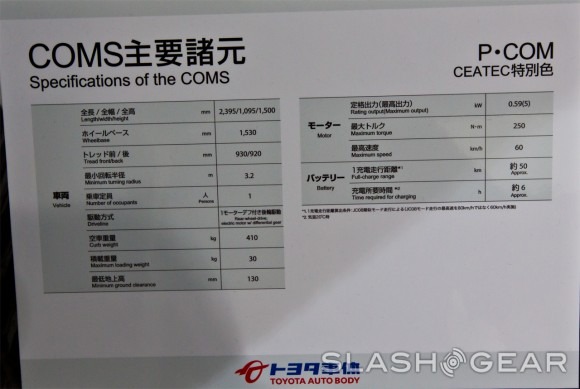 According to this chart we were given at Ceatec, the COMS can drive about 50 kilometers on a full charge. That means you won't be getting a ton of mileage out of a charge, but driving around a golf course is a lot different than commuting to and from work each day. The battery in the new COMS will take about six hours to fully charge, and the COMS is capable of driving as fast as 60 kilometers per hours, which isn't too bad all things considered.