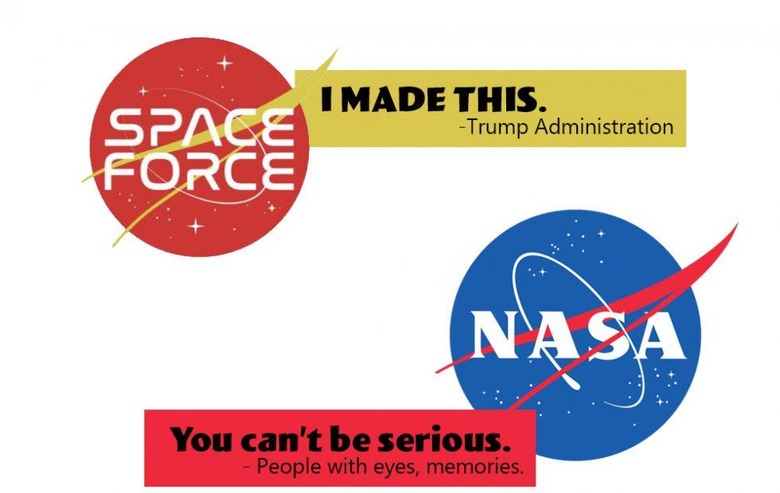 The groups already in charge of every duty Mike Pence and Donald Trump listed so far are the Air Force Space Command and NASA. They already exist. Also, have a peek at these logos next to already in-service logos from NASA, Star Trek, and a couple of video games – especially No Man's Sky, from which they seem to have lifted the font as well. Also be sure to ask Michael Okuda what he thinks of his design language being lifted without his permission and mangled beyond recognition.