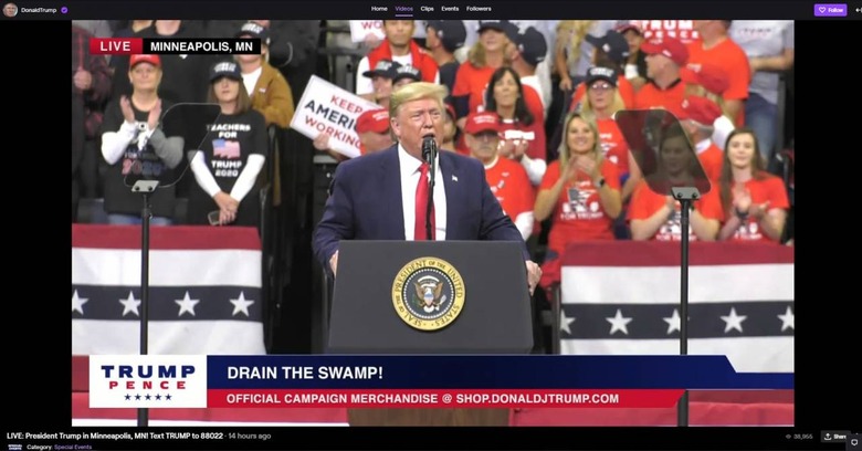 Funnily enough, attempting to watch the VOD of the rally surfaces an alert that says portions of the stream have been muted "as it appears to contain copyrighted content owned or controller by a third party," so it seems not even the President can get around Twitch's automated copyright systems. In any case, Trump's Twitch account is doing rather well here at this early point, as it already has 45,000 followers under its belt.