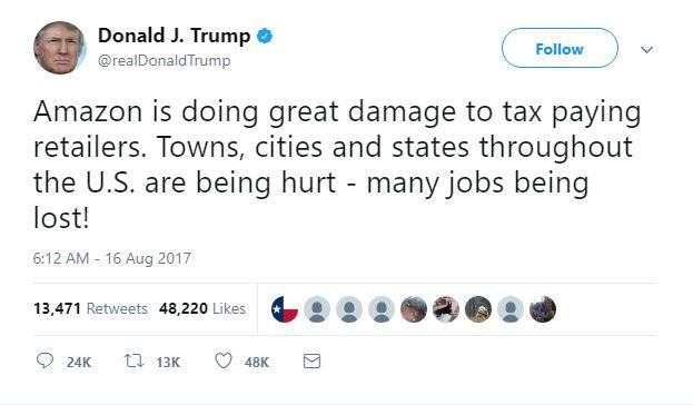 "Amazon is doing great damage to tax paying retailers," Trump said in his tweet. "Towns, cities and states throughout the U.S. are being hurt – many jobs being lost!" Trump seems to have posted this outburst with little prompting – the tweet before concerned the CEOs leaving his manufacturing council, while the tweet after congratulated the two remaining candidates in an upcoming election in Alabama.
