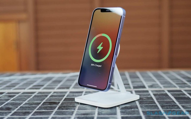 The result is a study metal base and a stand roughly 5-inches high. It pivots up to 75-degrees, relying on MagSafe's own magnets to hold the iPhone in place. Obviously for that to work you'll need an iPhone 12 mini, iPhone 12, iPhone 12 Pro, or iPhone 12 Pro Max, since they're the only models which are MagSafe-compatible at this stage.