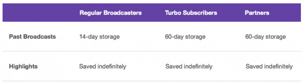 For Past Broadcasts saved automatically, there's a 14-day storage window. In that time, users can choose to export to YouTube, save to their own computer, or let the video die. Turbo Subscribers and Partners have a 60-day storage window instead of 14.
