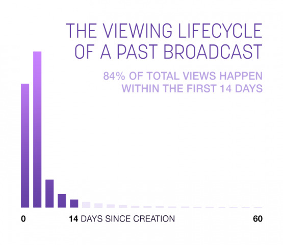 Above you'll see how videos rarely get seen after two weeks on the web. Closer to 60 days, viewership is almost nonexistent. Furthermore, Twitch suggests that a whopping 80% of the videos recorded and saved on their servers are never watched.