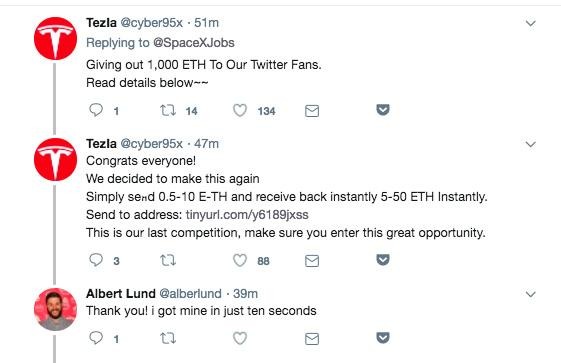 Musk's recent tweet about Tesla Semi truck deliveries, for example, was initially filled with crypto-scam accounts offering to send Ethereum to users who first send a little bit of the same to the scammer. Other scam accounts then responded to the initial scammer, proclaiming that the arrangement had worked and that they'd received their digital money.