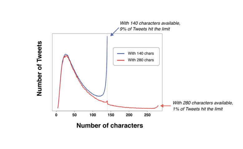 While Twitter does not provide exact numbers, it's safe to say here that all those Tweets that'd normally be crammed into 140 characters are now filling out longer Tweets. Also have a peek at that little jump in number of characters in the 280 test near 140. That either means people are so used to 140 characters that they now self-police their Tweets, or not every person in the test was given a heads-up about being part of it.