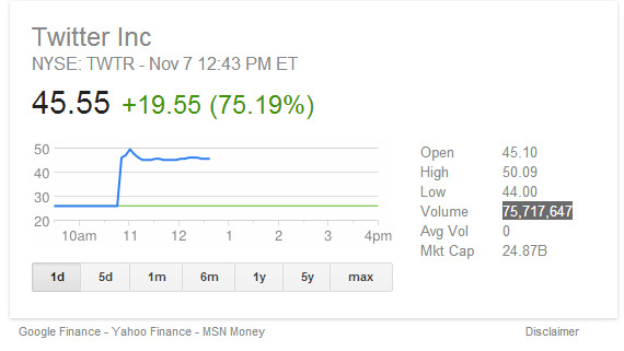 As this article is being published, the price of Twitter's stock – named TWTR for short – is holding in at around 45.50 per share. That's plus over 19 points for the day and an increase of 75% from the start of the day. Current volume for the stock in the market today is at 75,717,647 at the time of this article's posting.