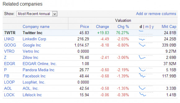 The company we'll expect to be comparing Twitter to on the market the most, Facebook, currently sits at 48.44 a share with a change of negative 0.68 for the day so far. Market cap for Twitter is currently extremely similar to that of LinkedIn, with Twitter's cap at 24.81B and LinkedIn at 24.25B.