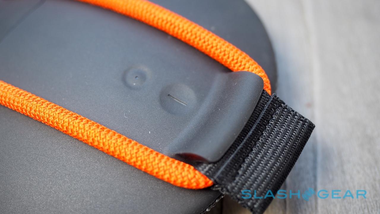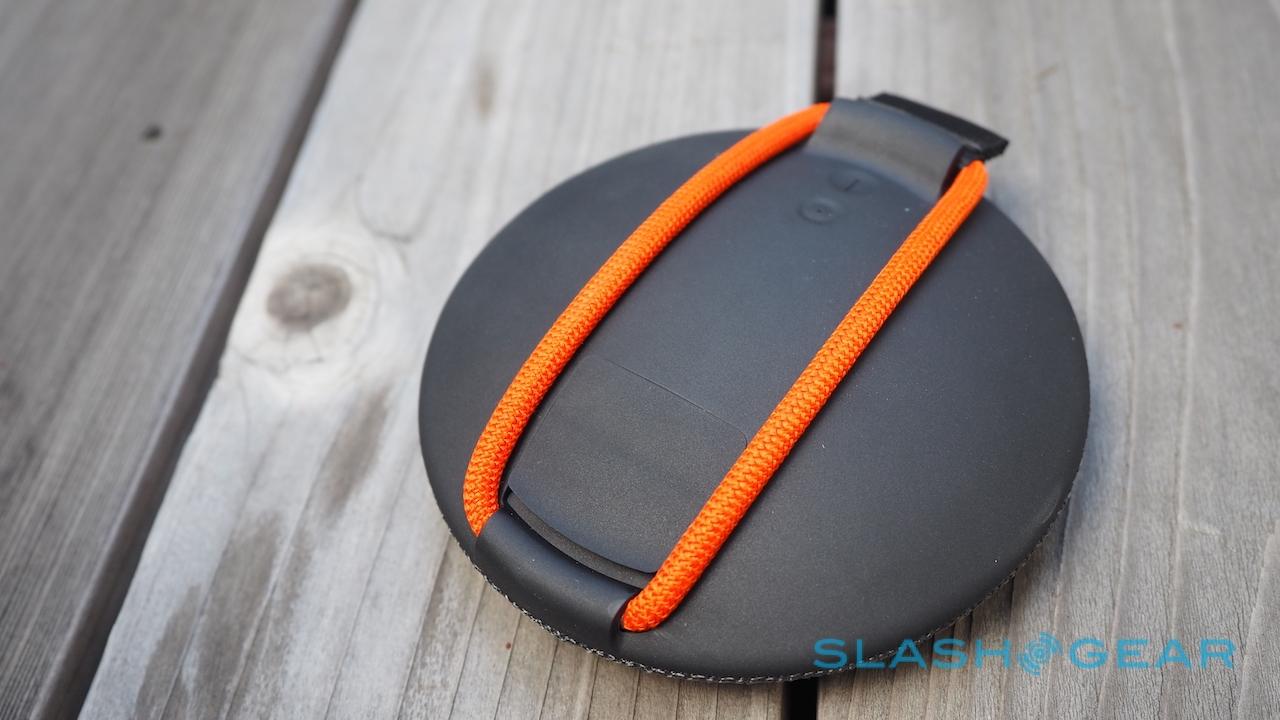 A power button and status LED are on the back, while the huge plus and minus on the front control volume, as you might expect. At 5.3-inches across you can grip it in one hand, but tug loose the elastic cord and you can dangle it from a door handle, cinch it to a fence or your bike handlebars, or wrap it around the strap of your rucksack.