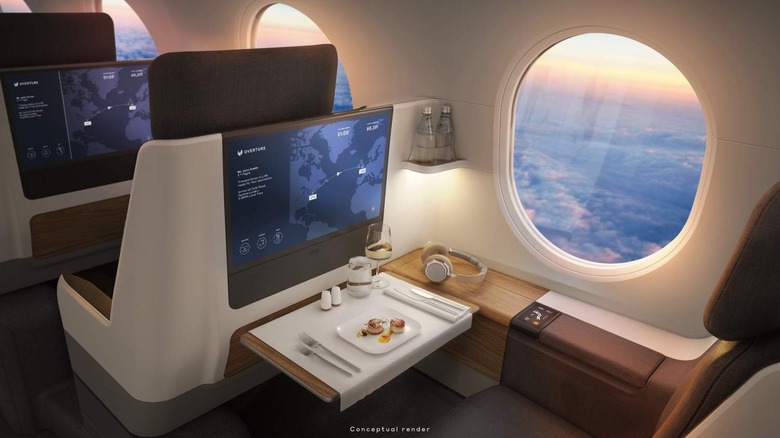 Overture, meanwhile, is expected to carry 65 to 88 passengers, depending on interior configuration. It'll cruise at 60,000 feet, and has a range of 4,250 NM (or 4,888 miles). The cabin is set out with an entirely business class experience, with every seat having direct aisle access and sizable windows.